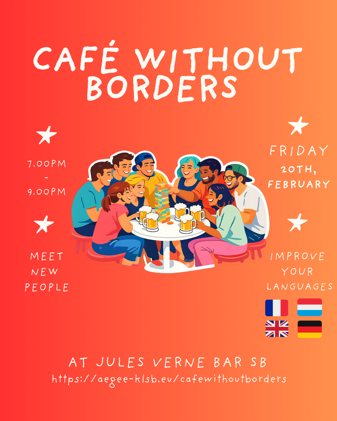 Home Café without Borders Café without Borders Café without Borders Thanks to our institutional Partner! #Cafewithoutborders + Add to Google Calendar + iCal / Outlook export The event is finished. Tags: AEGEE, café des langues, franco-allemand, metz, SalutMetz, trip Date Feb 20 2026 Expired! Time 7:00 pm - 9:00 pm Location Saarbrücken Category DFT francoallemand grossregion Metz trips Organizer SalutMetz! – Organisation Team Email join@SalutMetz.eu Website https://SalutMetz.eu Share this event