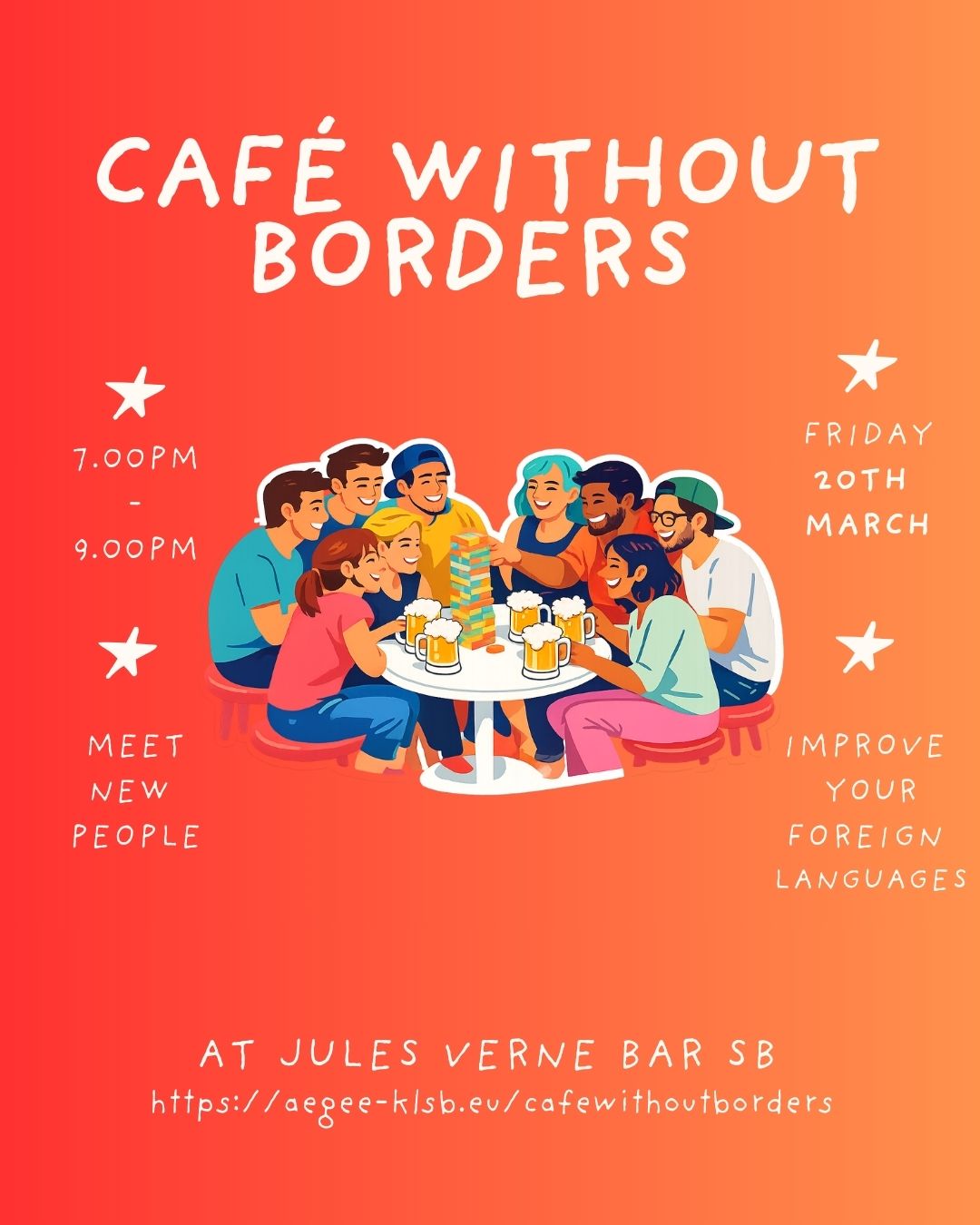 Home Events Café without Borders Café without Borders Thanks to our institutional Partner! #Cafewithoutborders + Add to Google Calendar + iCal / Outlook export 00 days 00 hours 00 minutes 00 seconds Tags: AEGEE, café des langues, franco-allemand, metz, SalutMetz, trip Date Mar 20 2026 Time 7:00 pm - 9:00 pm Location Jules Vernes -Saarbrücken Paul-Marien-Straße 11, 66111 Saarbrücken Website https://maps.app.goo.gl/zZ5GJatBWuUUjfFf7 Category francoallemand grossregion Metz trips Organizer AEGEE-KLSB e.V. , Grossregion Email grossregion@aegee-KLSB.eu Share this event
